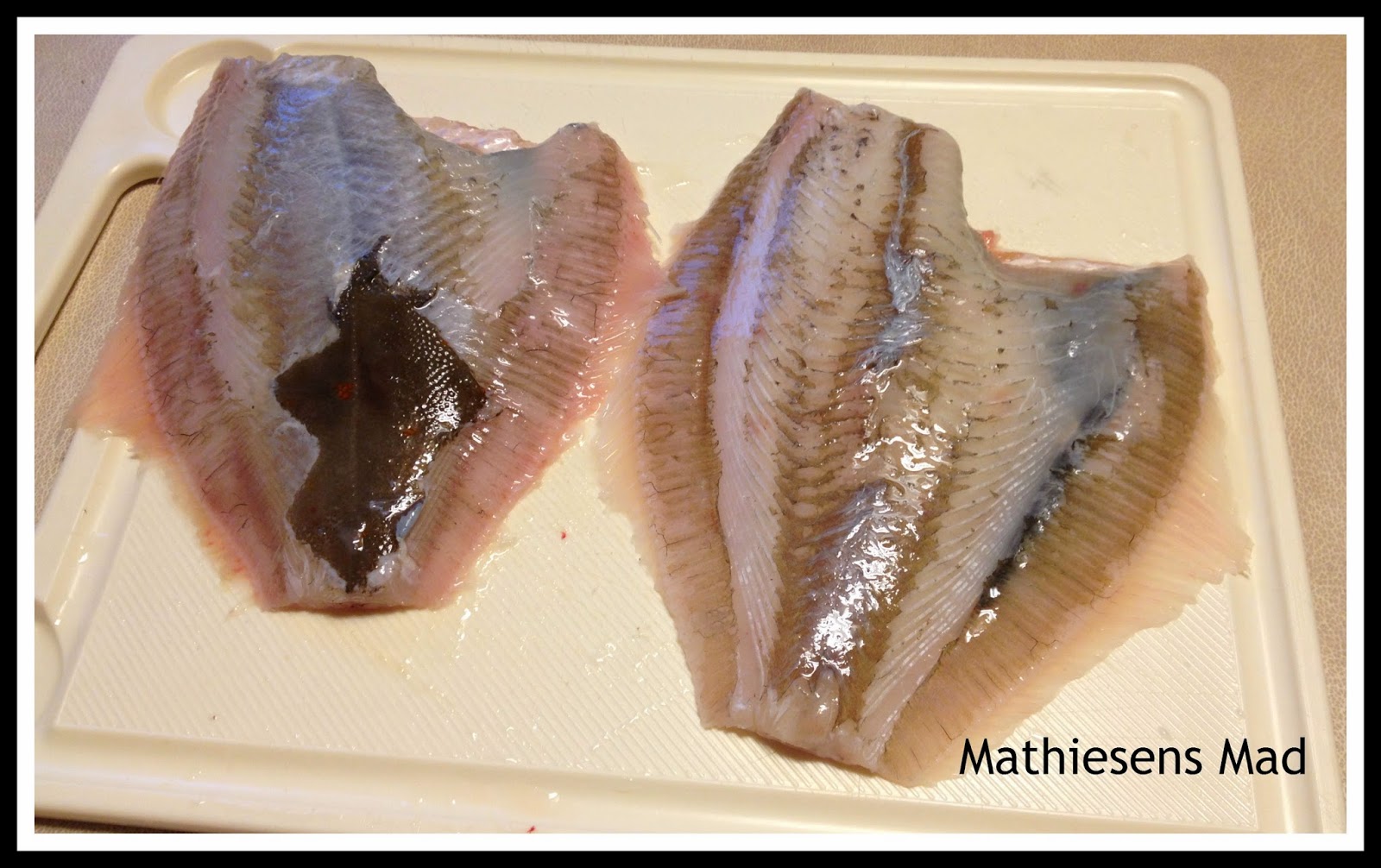 Rødspætter kendes på de røde pletter, som der lige ses lidt af på skindet her. Jeg glemte at tage et billede af fiskene hele.