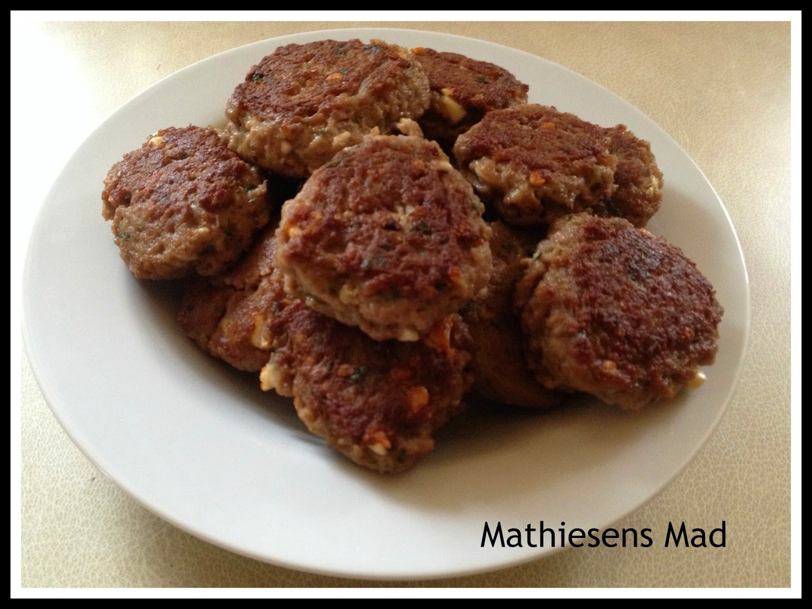Smelt olie, smør eller margarine på en pande og form frikadeller med en ske og læg dem på panden. Dyp skeen i fedtstoffet mellem hver frikadelle. De må gerne være lidt mindre end almindelige frikadeller.