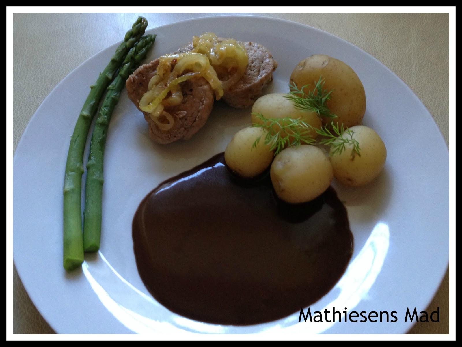 Server med grønne asparges, der er kogt i 2 min. samt sovs og nye kartofler.