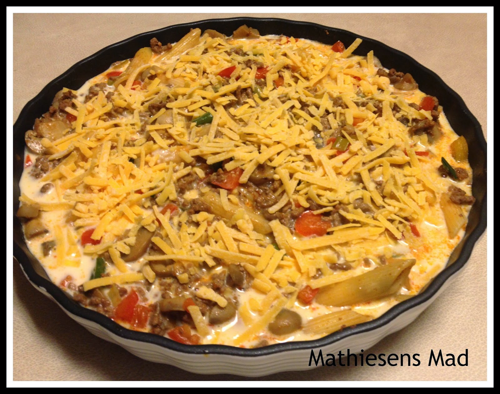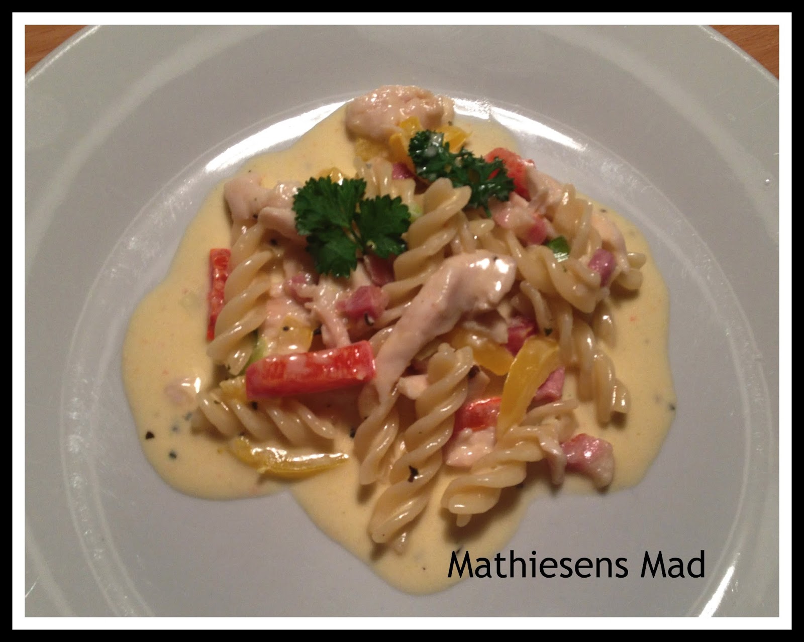 Kom pasta, porre og kylling i et fad, krydr med salt og peber og hæld mornaysauce over.