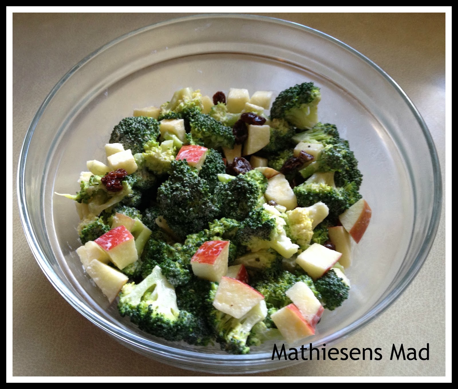 Når broccolistykkerne har kølet af, røres de sammen med dressingen og derefter med æbletern og rosiner.