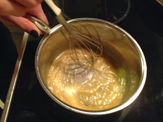 Kom æggeblommerne i gryden med essensen. Tænd for gryden på svag varme og pisk til saucen er tyk og cremet.